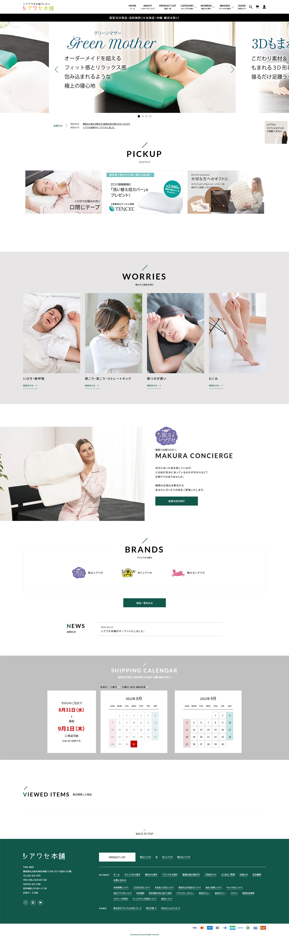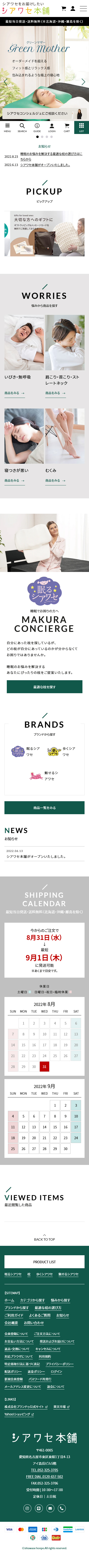 健康グッズを通販しており、「眠るシアワセ」「歩くシアワセ」「魅せるシアワセ」「はねるシアワセ」のカテゴリ分けがされています。