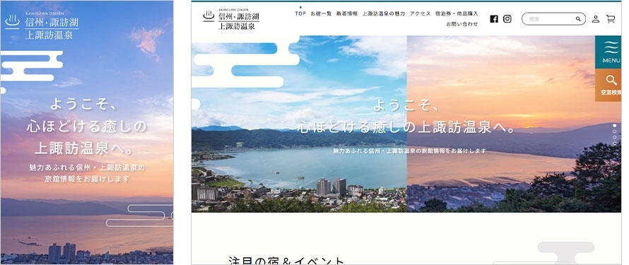 諏訪湖温泉旅館協同組合 https://www.suwako-onsen.com/ 構築方法: Shopify(ショッピファイ) 業界・業種: 宿泊業 地域: 長野県 信州の自然と豊富な湯量が魅力の上諏訪温泉の、旅館・ホテルの検索・予約や、宿泊券が購入できる諏訪湖温泉旅館協同組合様の公式サイト。 上諏訪温泉お得な情報やおすすめの観光スポット情報も満載です。
